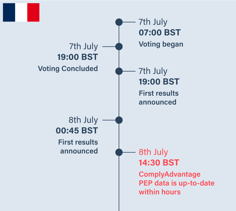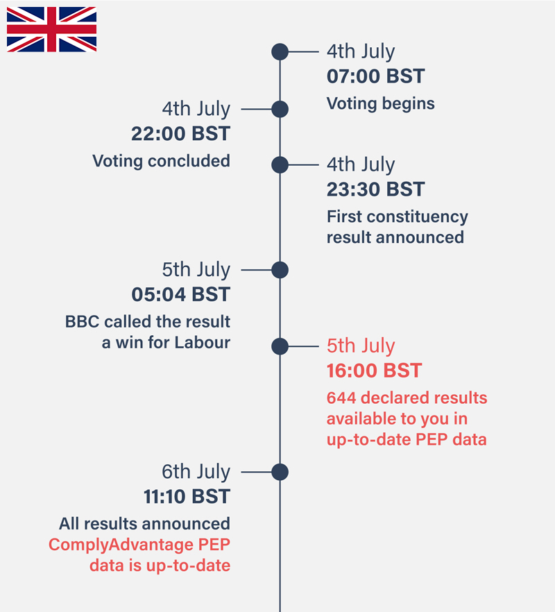 UK election: The election results came between July 5 and 6. ComplyAdvantage updated the PEP data simultaneously, and it was all available to you in real-time.