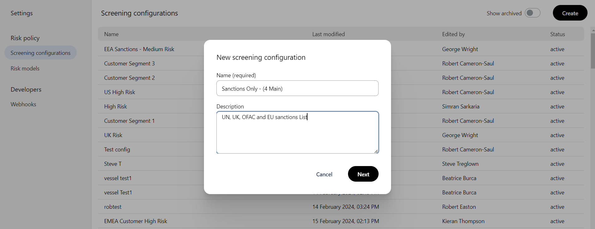 Screening configurations enable you to fine-tune searches by defining risk parameters specific to your customer segments. This allows you to apply a risk-based approach to your customer screening. The outcome is a targeted screening process that effectively reduces false positives while maintaining robust oversight.