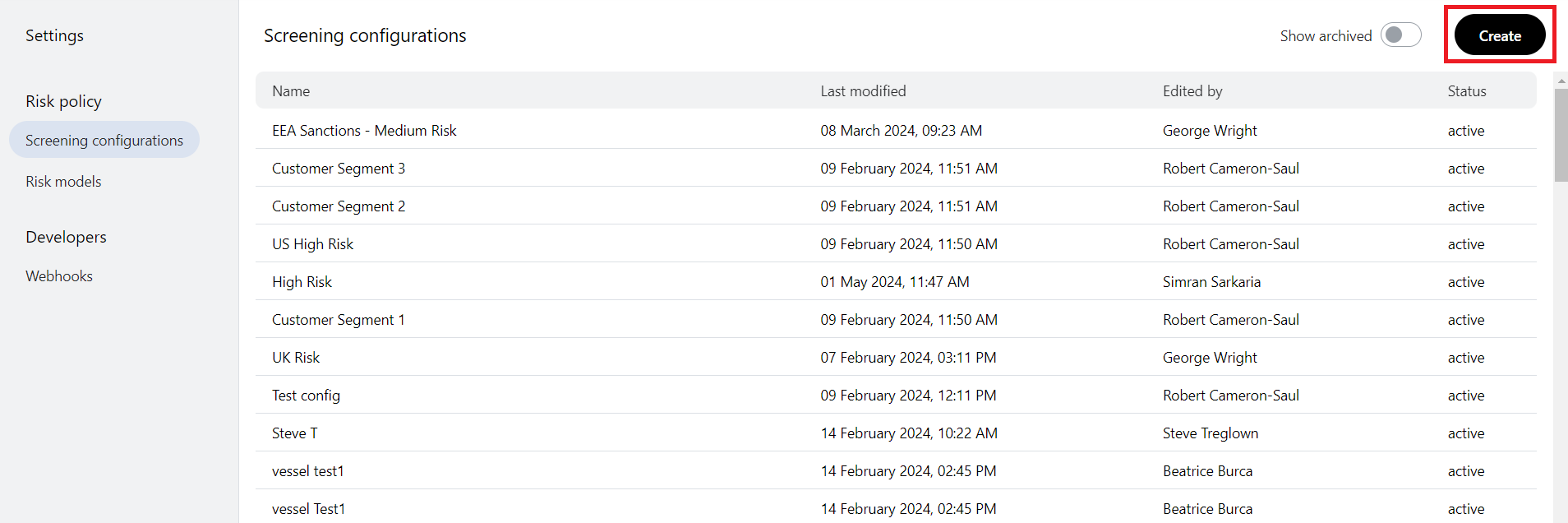 You can archive a screening configuration if you don’t want analysts to use it anymore when creating customers. Existing customers using the screening configuration will continue to do so.