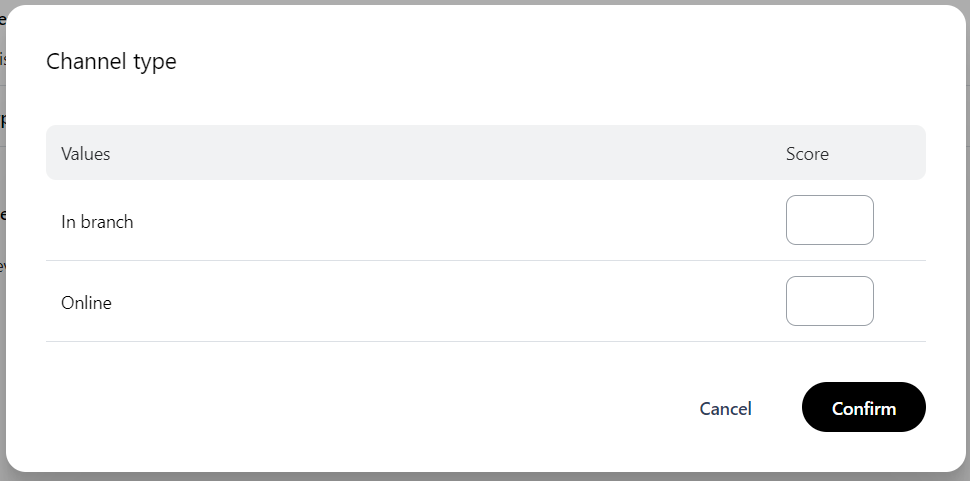 There is one attribute available for the Channel category, which is Channel type. This is the onboarding channel the customer used to sign up. The values are predefined as In branch and Online.