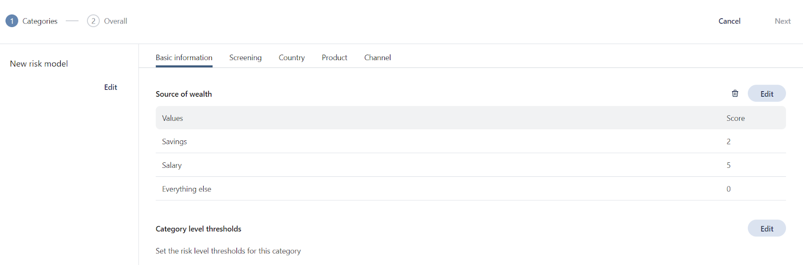See Setting category thresholds for the next part of the process to create a risk model.