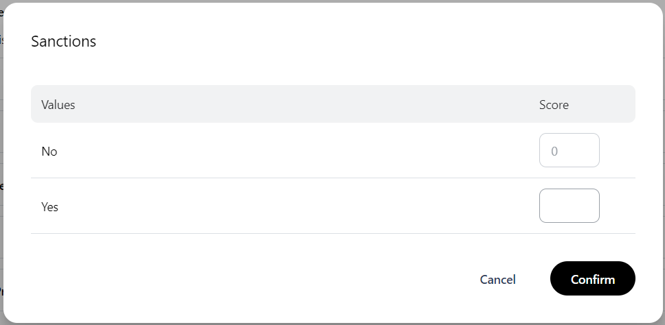 When adding attributes to the Screening category there are only two values available, Yes or No, depending on whether an anti-money laundering (AML) type, such as Sanctions, applies to the customer. By default, No has a score of 0. You can set a score for Yes.