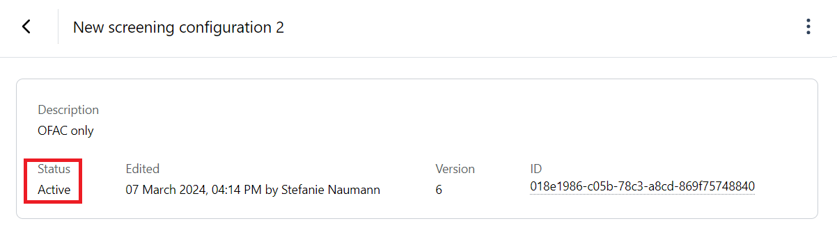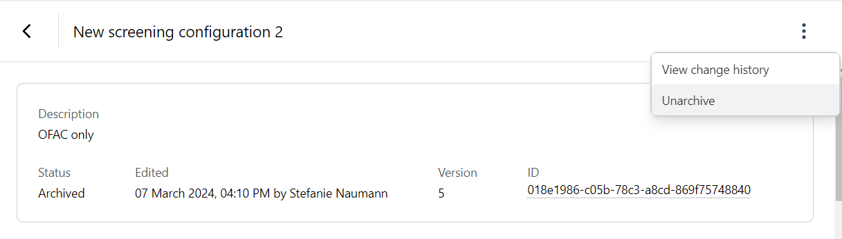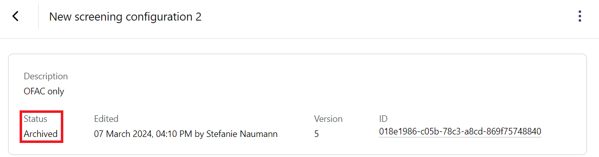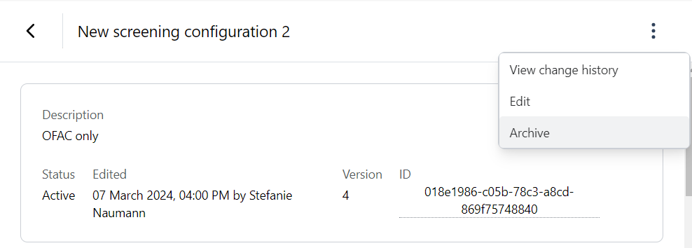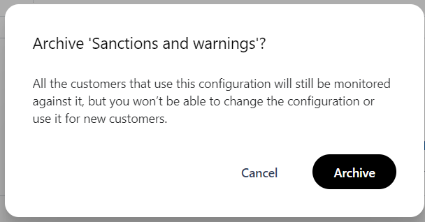 You can archive a screening configuration if you don’t want it to be selectable by analysts as part of the customer creation workflow.