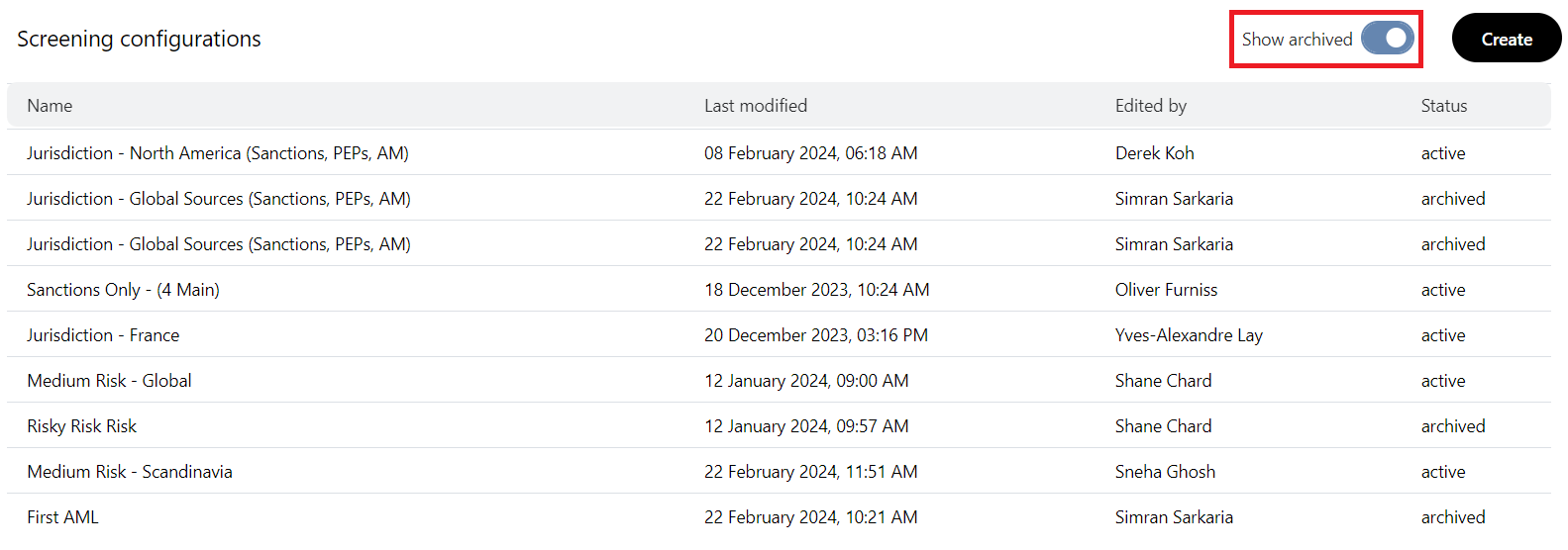 Toggle on Show archived on the screening configuration list to show archived configurations.