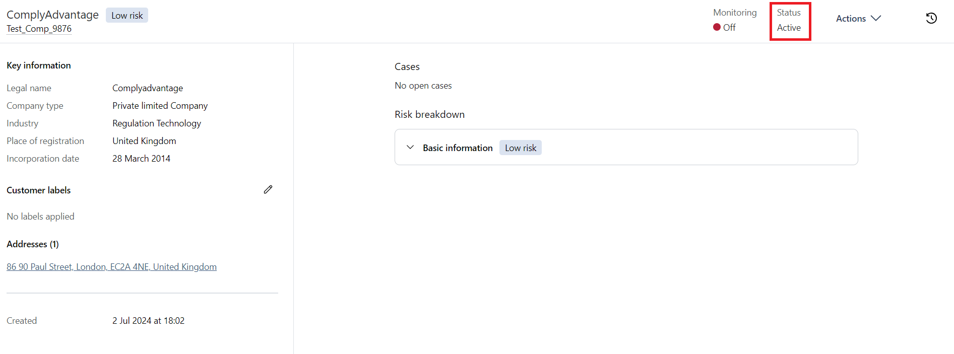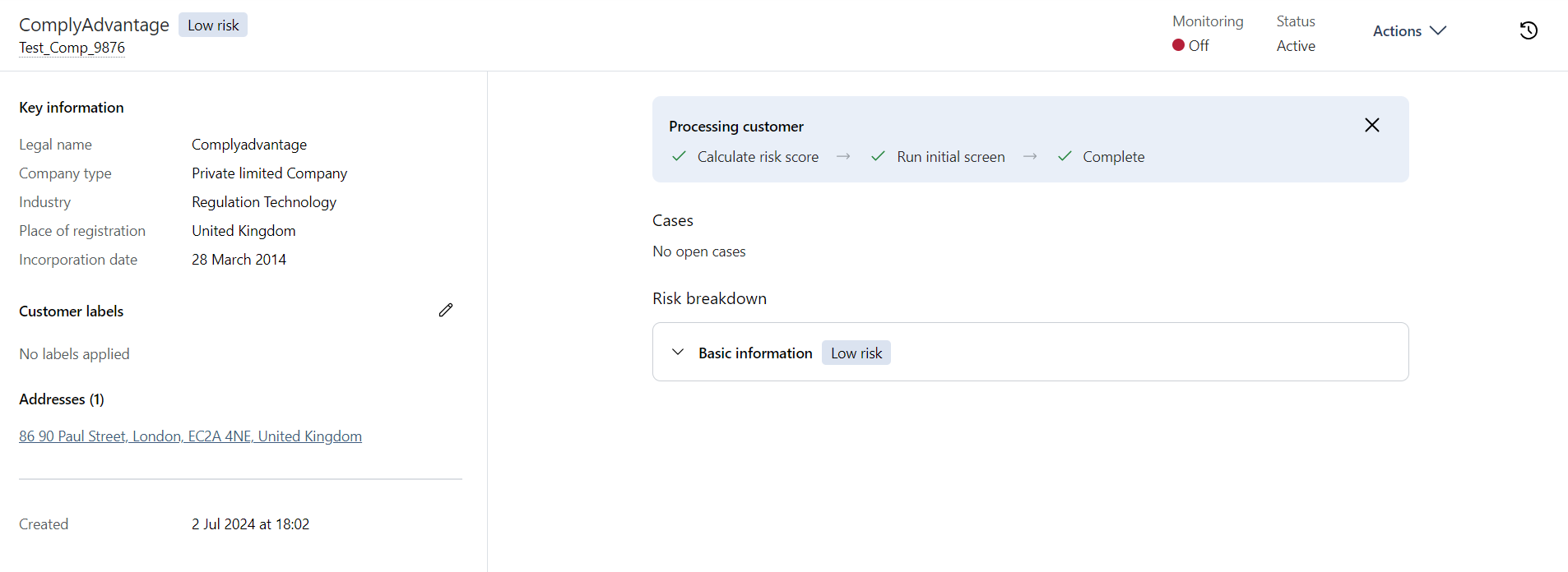If no hits are found during screening then processing is complete. You'll see an Active customer status appear at the top right of the screen.