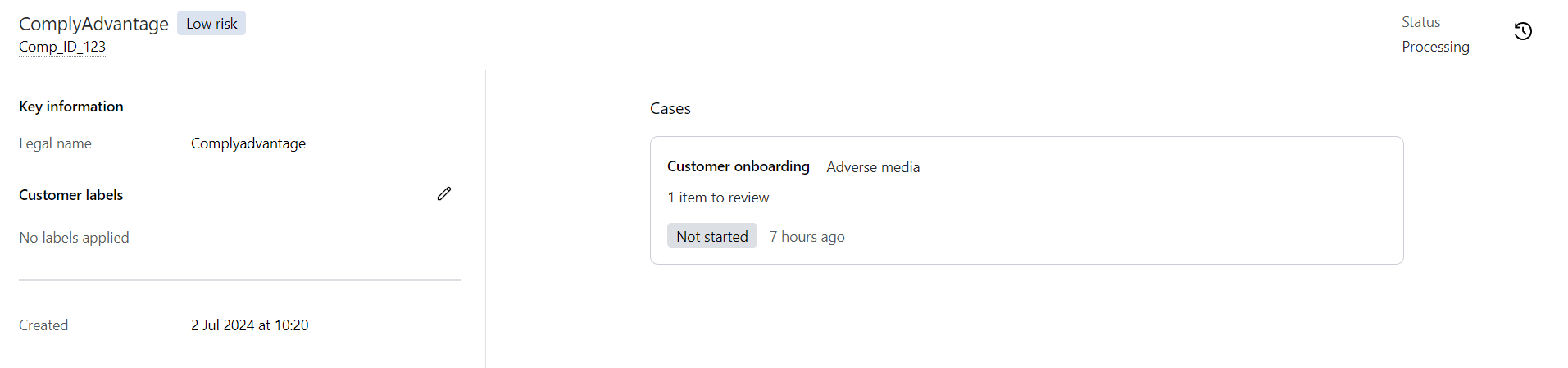 If hits are found during screening, these will be summarized in a box under the Cases heading. Click on the box to be taken to the Cases page, where you can remediate and close the cases. After the cases have been resolved, the customer status on this page will change from Processing to Active.