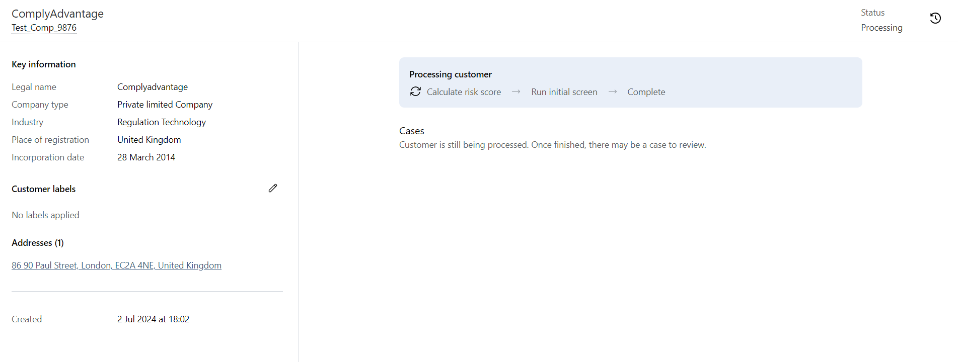 Your company will now be created, screened, risk scored (if appropriate) and displayed within the Customers page. Screening and risk scoring may not complete instantly: you can see progress in the blue Processing customer box.