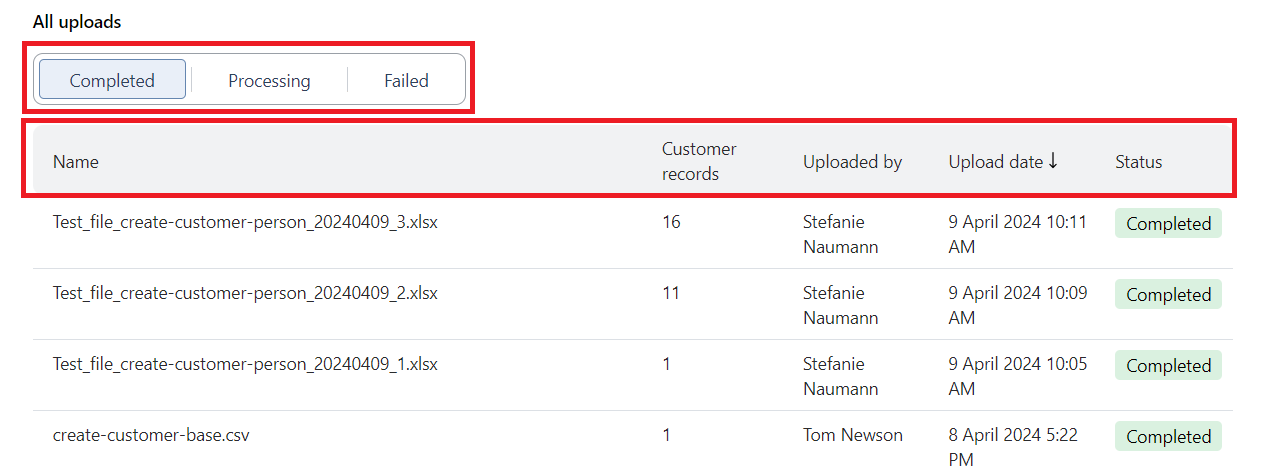 By default, the 'All uploads' table shows all files that are Completed, Processing or Failed. The results are sorted by Upload date, the most recently uploaded file is at the top.