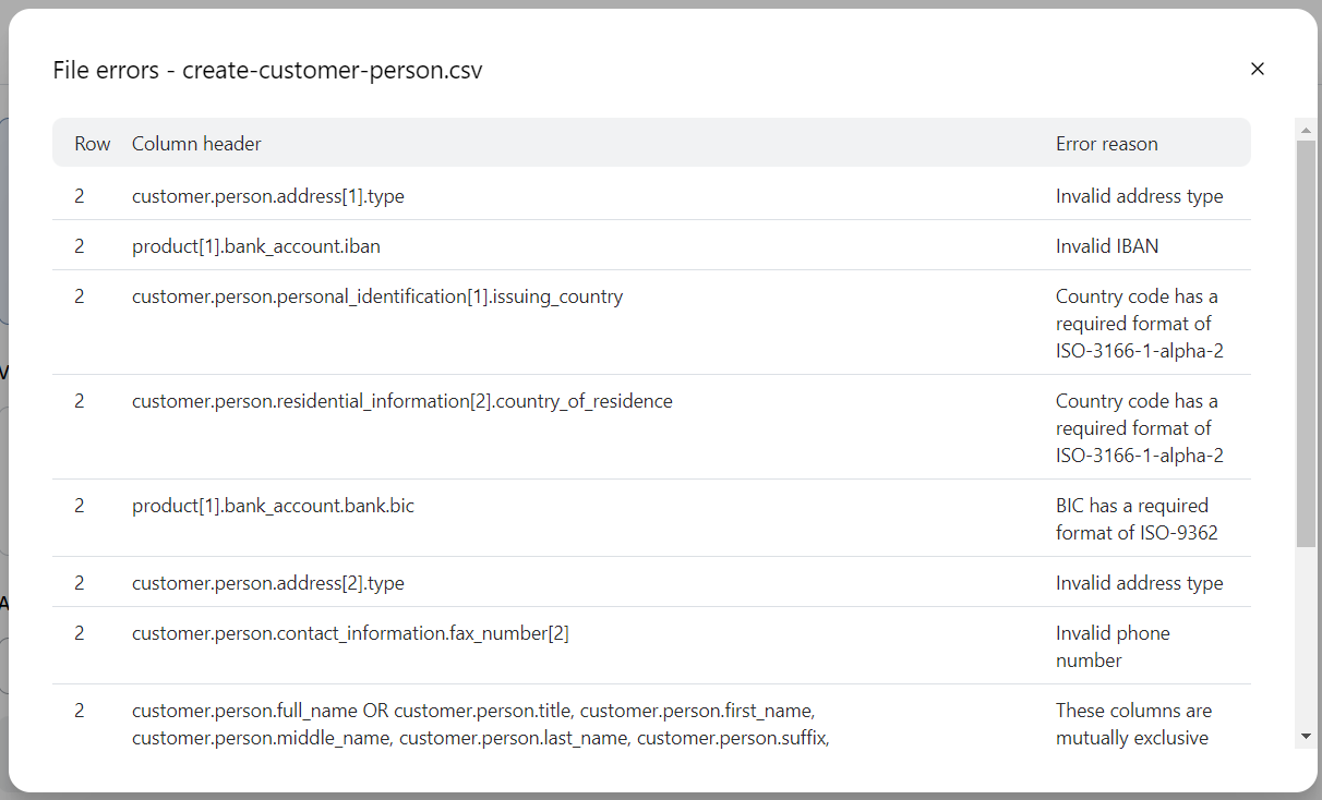 Be aware that the number of returned errors is limited to 50. If your file contains more errors, these will be returned on re-upload until all errors have been resolved.