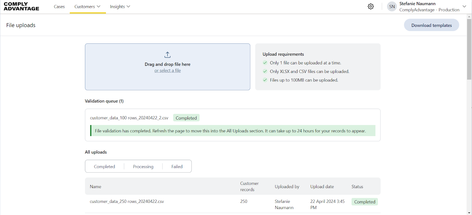 When the file validation is successful, the file is uploaded and will show as completed. Please be aware that some processing steps are still happening in the background after the upload shows as completed. Your records may take up to 24 hours to appear.