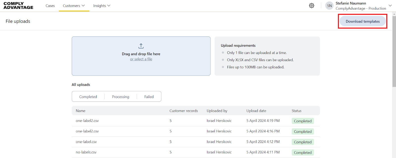 You can drop CSVs containing your list of customers to create-and-screen into our SFTP server. To ensure that the correct formatting is used, you can download templates from the file upload page in the Mesh web-app and use these to create your customer record files.