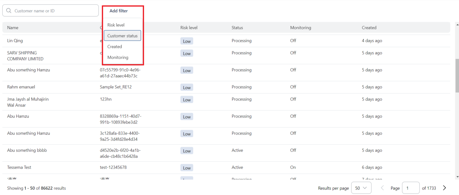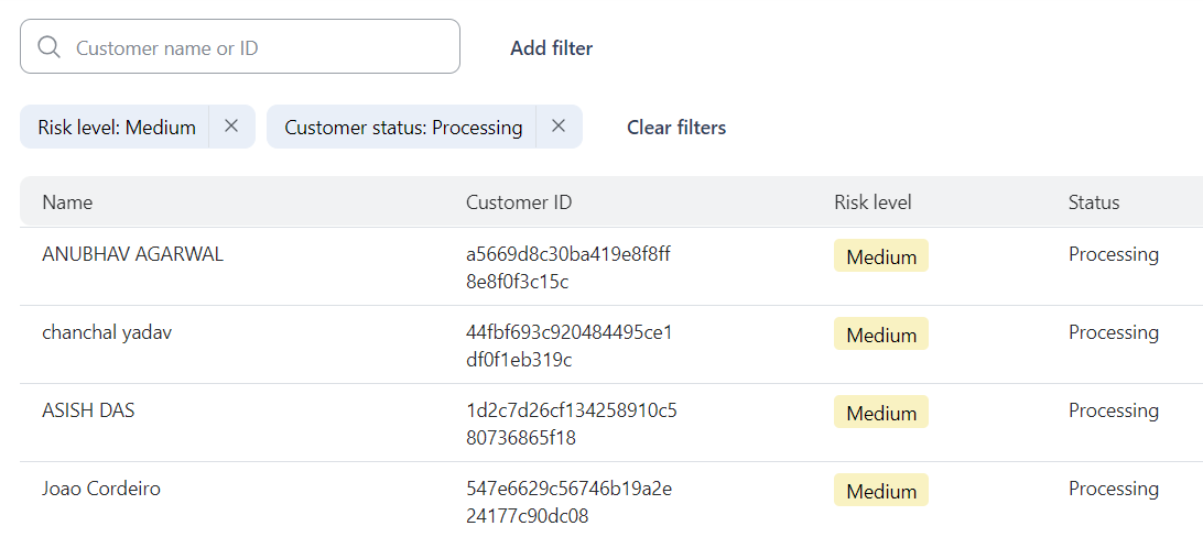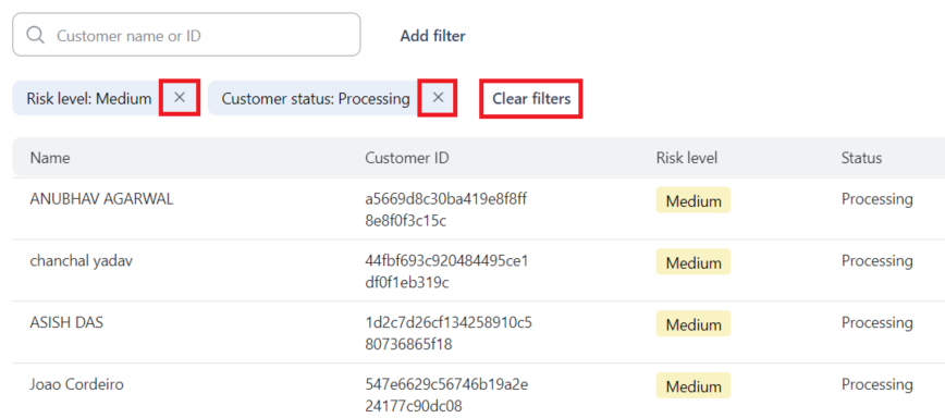 You can apply as many filters as you need. This includes multiple options for the same filter, for example you can choose to display customers with a risk level of either Low and Medium.