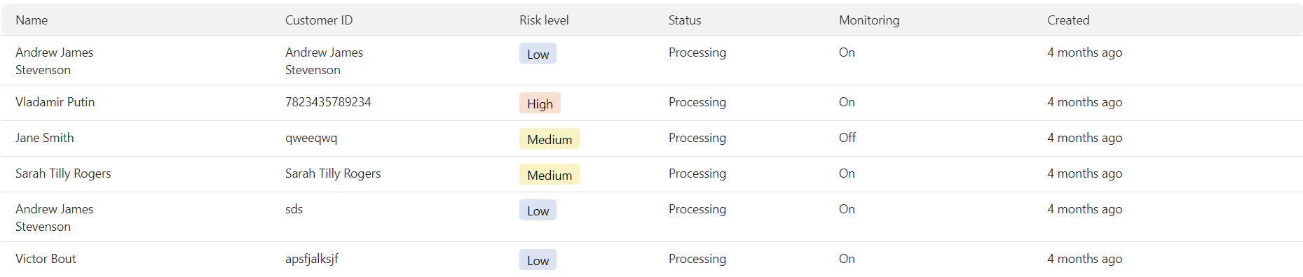 You can sort the Customers list by any column, ascending or descending. Ascending means from smallest to largest, i.e. 0-9, A-Z, oldest to newest or, for Risk level and Status, from lowest to highest importance. Descending means from largest to smallest, i.e. 9-0, Z-A, newest to oldest or, for Risk level and Status, highest to lowest importance.