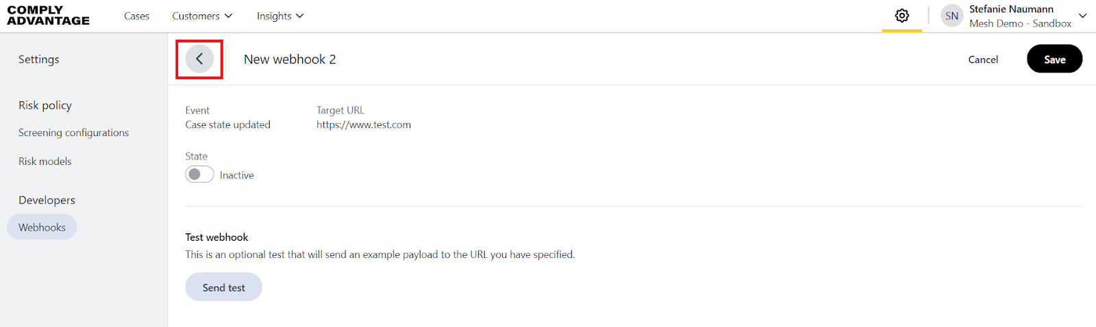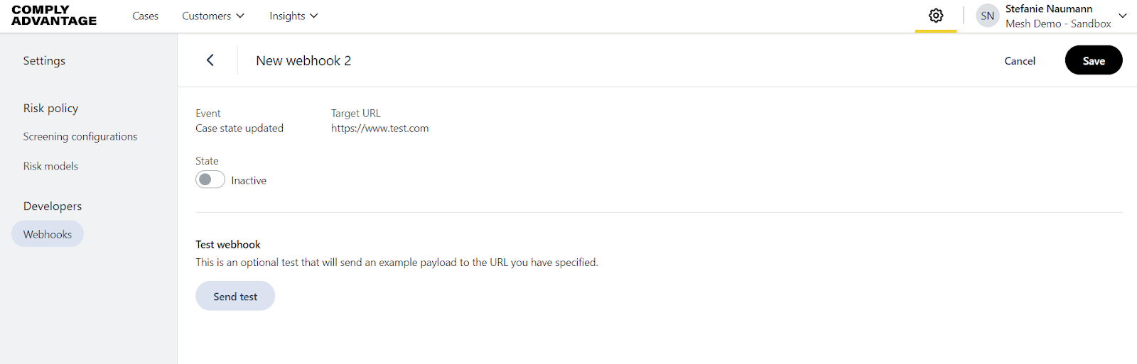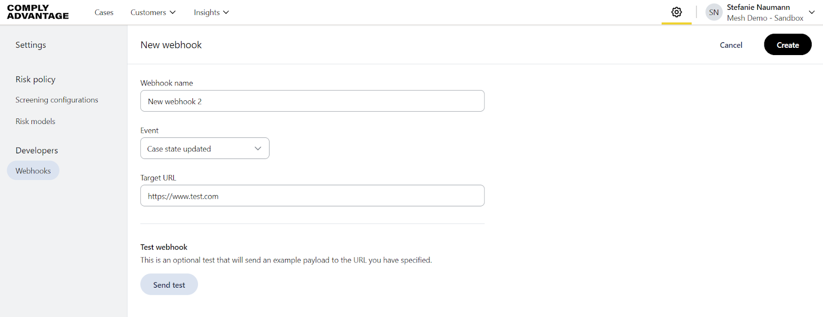 When you complete all the form fields, the Send test button is enabled. Click the button to send an example payload to the URL you have specified. This test is optional.