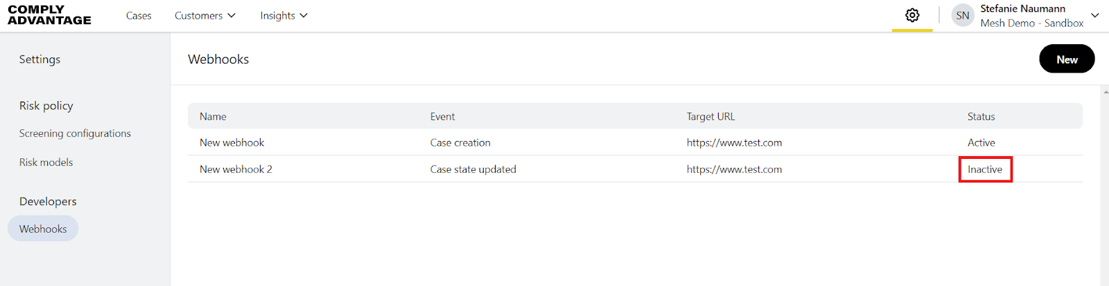 Changing a webhook’s status using the Mesh web application