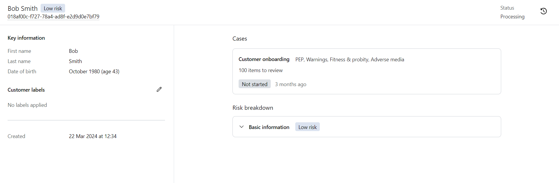 Your person will now be created, screened, risk scored (if appropriate) and displayed within the Customers page. Screening and risk scoring may not complete instantly: you can see progress in the blue Processing customer box.