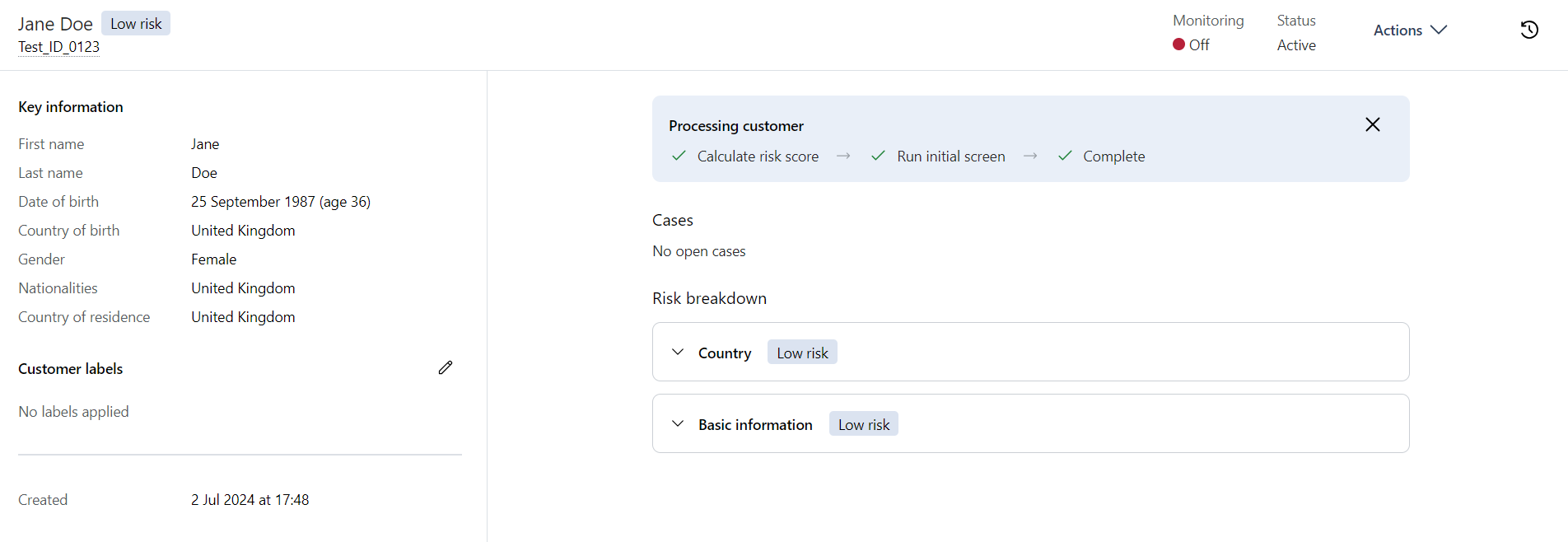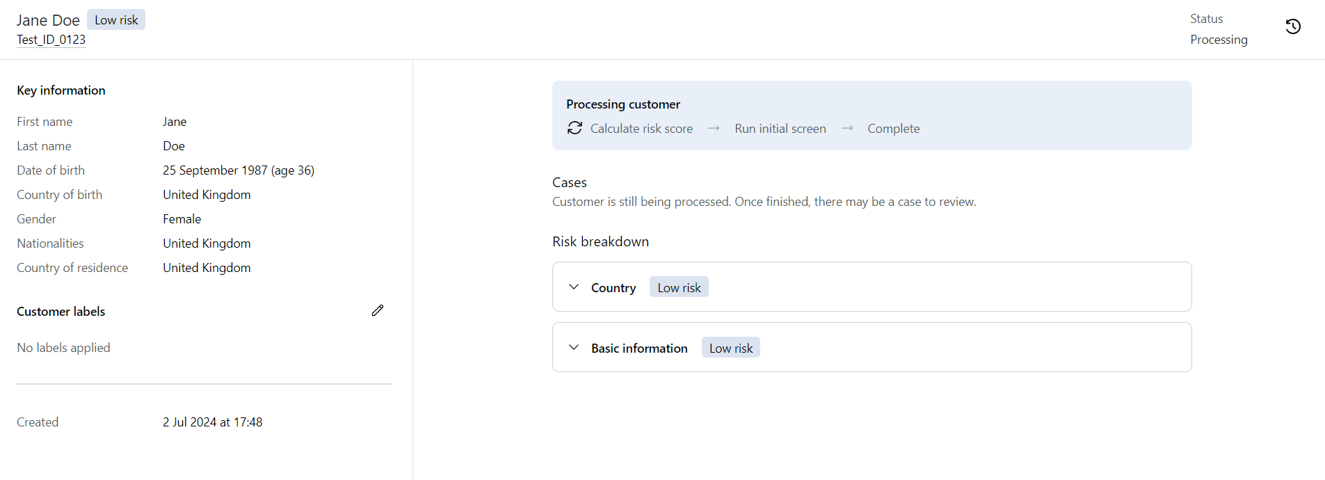 Risk scoring can happen quite quickly. When it's complete, you'll see the overall risk score (in this case Low risk) displayed at the top left, next to the customer's name. If you were able to provide additional customer details above, you'll also see a breakdown of the risk.