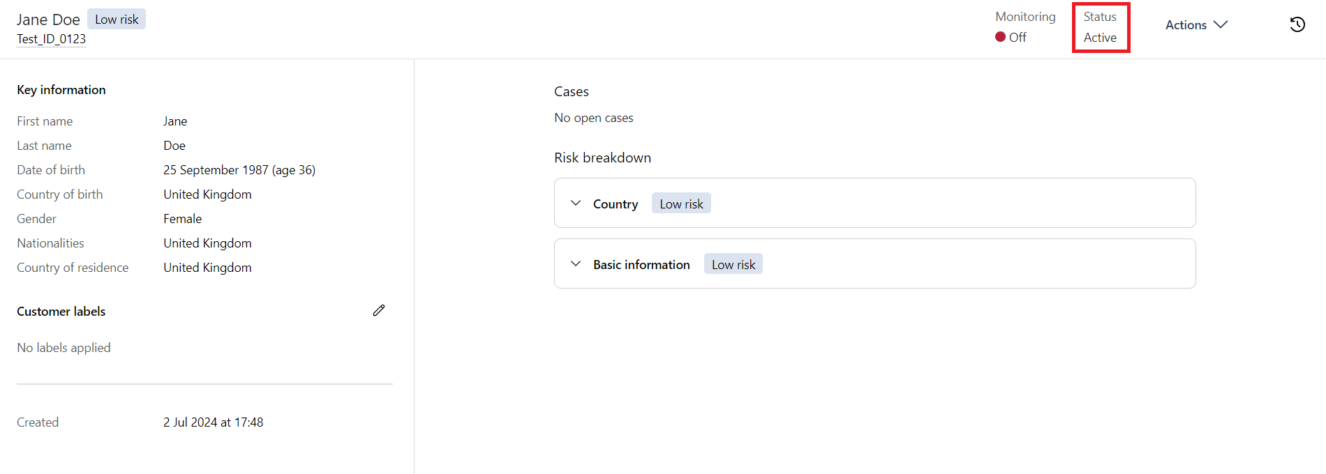 If no hits are found during screening then processing is complete. You'll see an Active customer status appear at the top right of the screen.