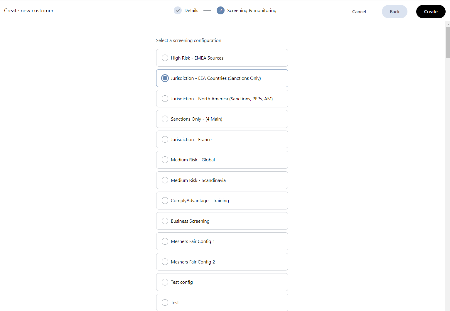 As part of creating a customer, Mesh performs an initial screening on them: you can choose which screening configuration to use for this. If you have a risk model set up for your account, Mesh will also deliver a risk score assessment for the person.