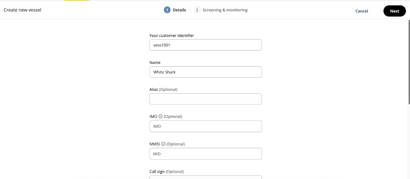 Optional fields such as IMO, MMSI, and Call sign can be populated to improve profile completeness. While not currently used for matching, they will support future entity resolution.