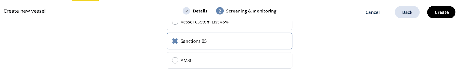 Select the Screening configuration you wish to use for this vessel and click Create.