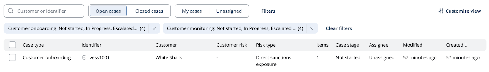 This view displays the Case type, the customer ID, customer name, risk type(s), number of items to remediate and the case status