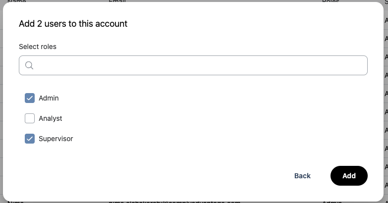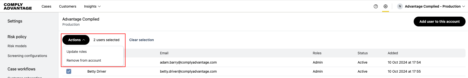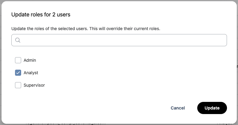 One or more users can have their roles updated in the current account using the bulk functionality on the user list.
