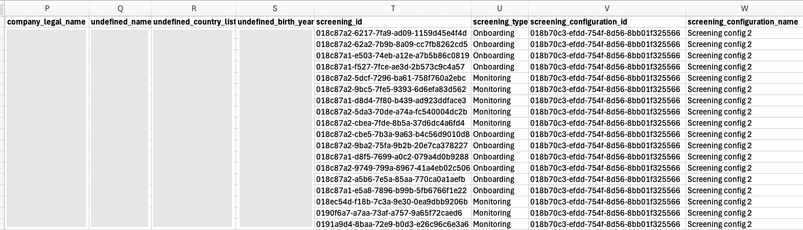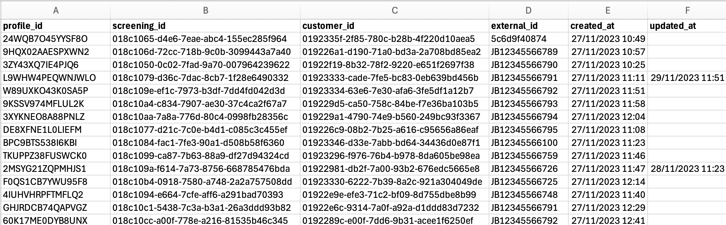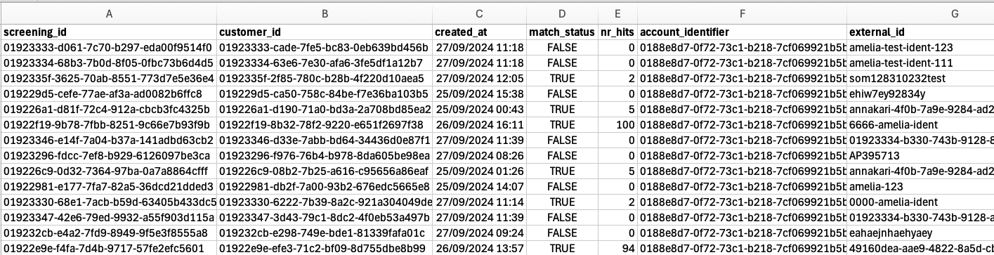 The screenshot below shows an example of the Customer Screening export. The columns are A to G from left to right.