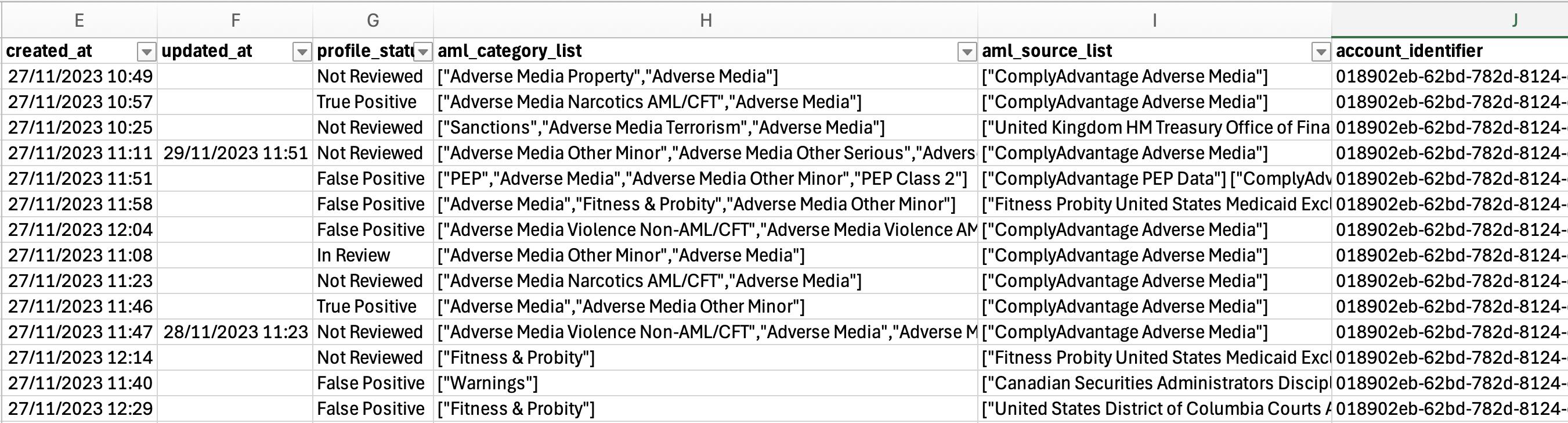 J | account_identifier | Your ComplyAdvantage account ID. This will be the same for all the rows of the export. |