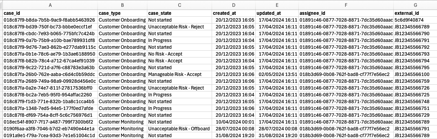 The Screening and Monitoring Cases export contains the creation date, type and decision for each case. It also shows who worked on the case and the screening configuration applied. There are customer details, so that the exported data can be paired with your data for analysis.
