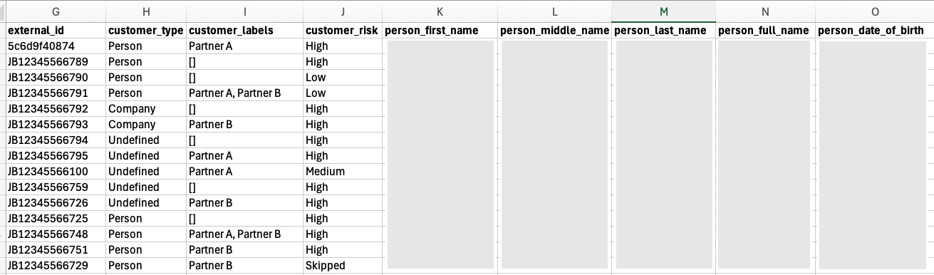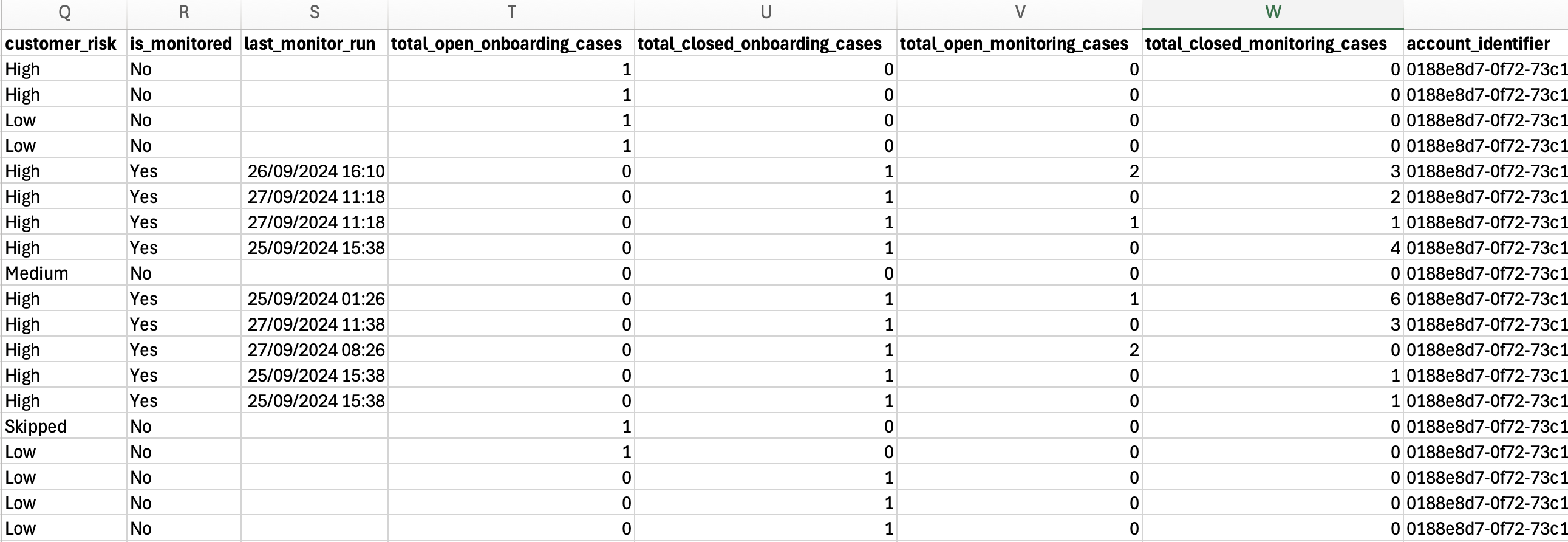 The Customer export contains information about your customers, including their creation date and monitoring status. It also details each customer's risk level and their case count.
