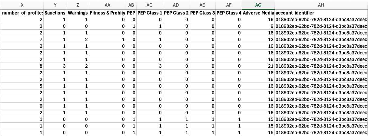 AH | account_identifier | Your ComplyAdvantage account ID. This will be the same for all the rows of the export. |
