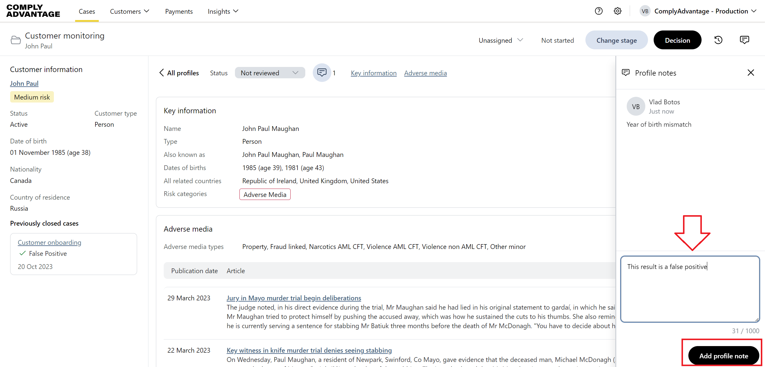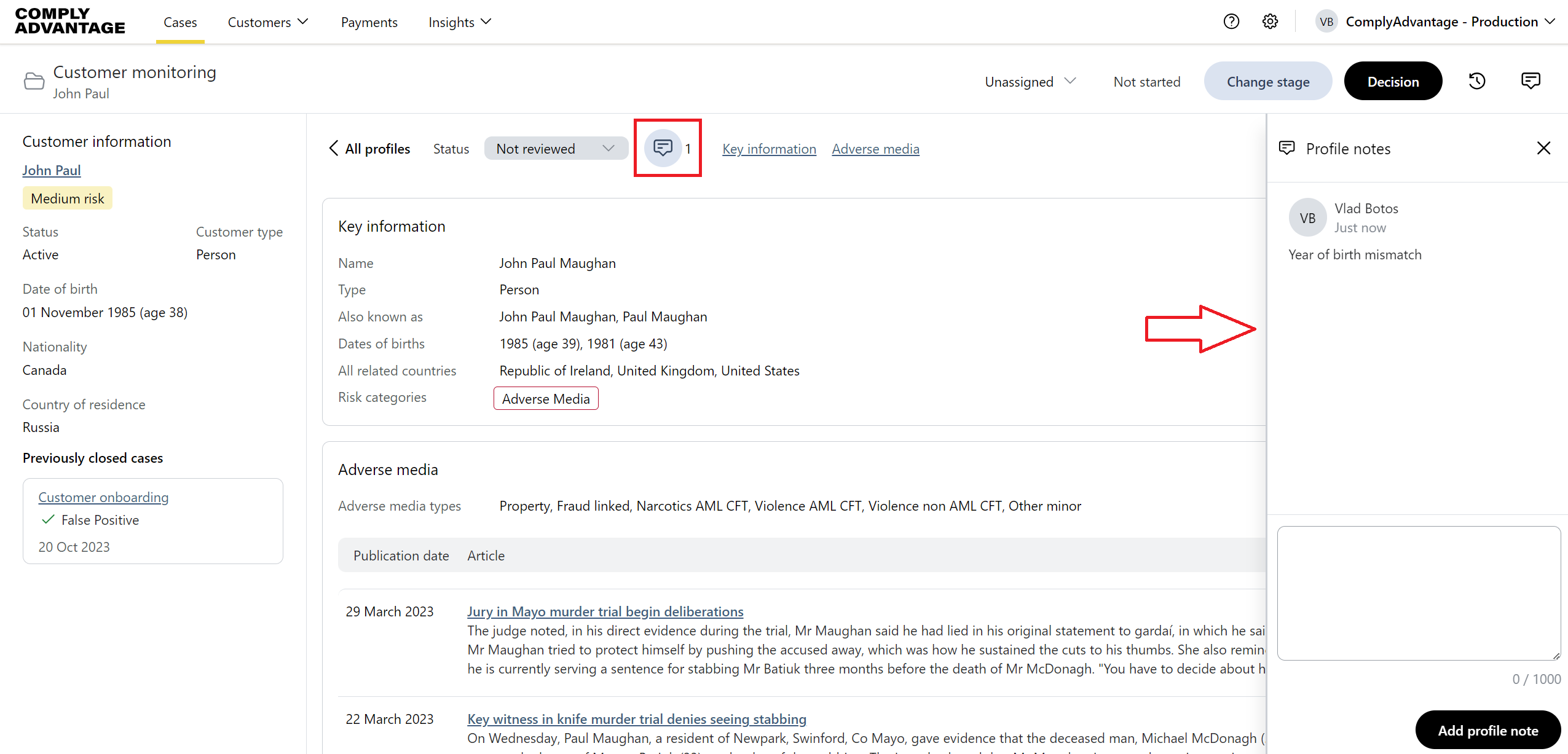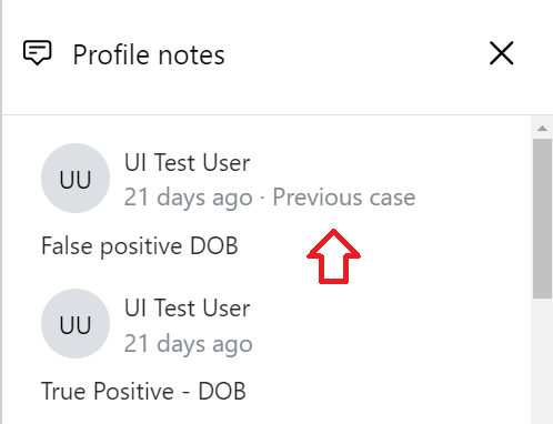 Remark: The Profile notes pane will show notes added when investigating the same screening result, in other cases (onboarding or monitoring) for the same customer. These will be highlighted with the tag Previous case.