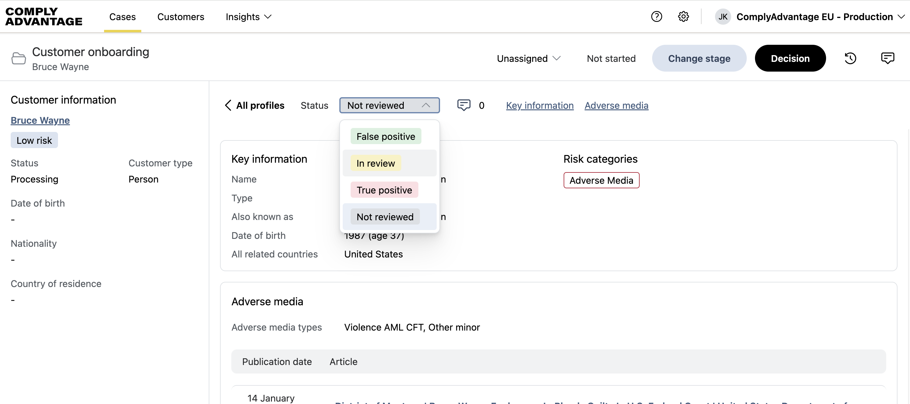 Once you have identified whether the profile hit is a true or false positive, you can change the status of the screening result accordingly.