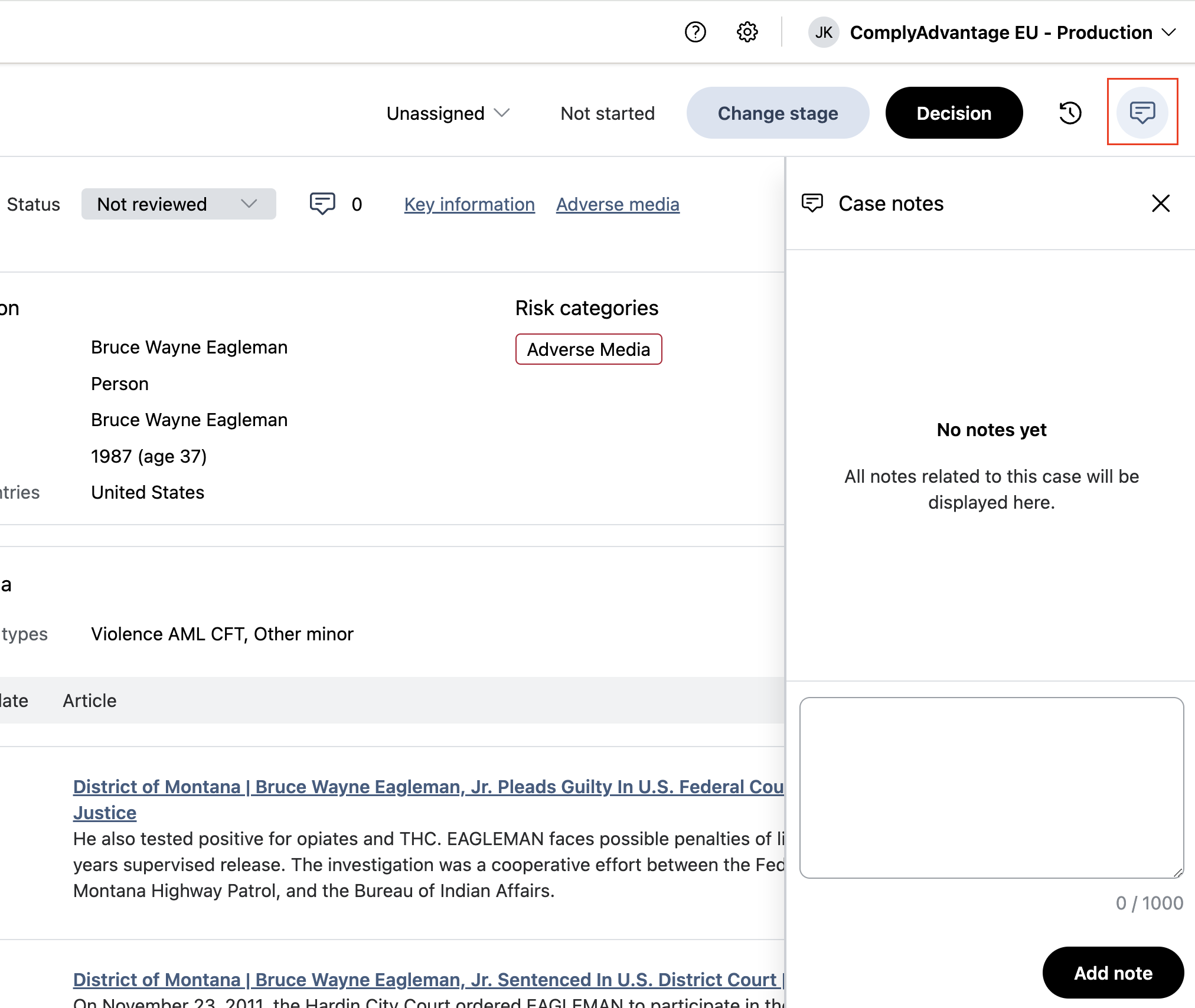 You can capture your findings on the case as a note for future reference. Go to the case you want to leave a note on and click the notes icon in the top-right corner.