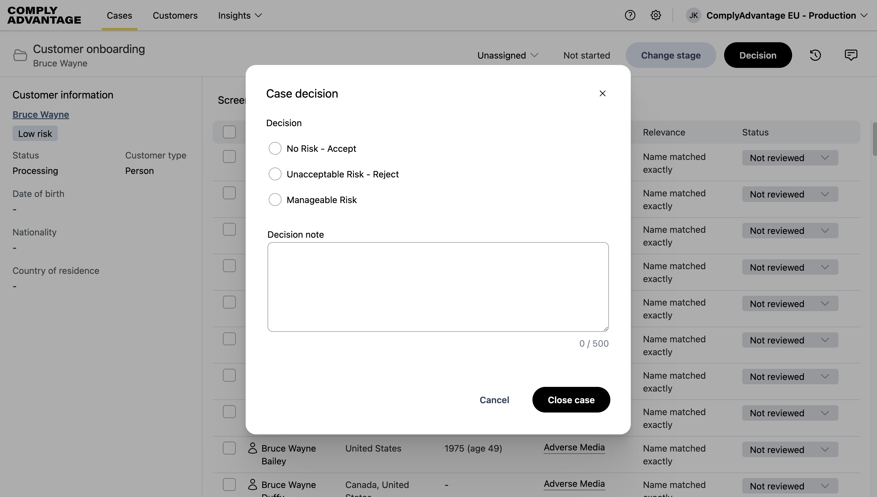 When you have made a decision about the risk of a case, you can close the case by assigning a decision to it.
