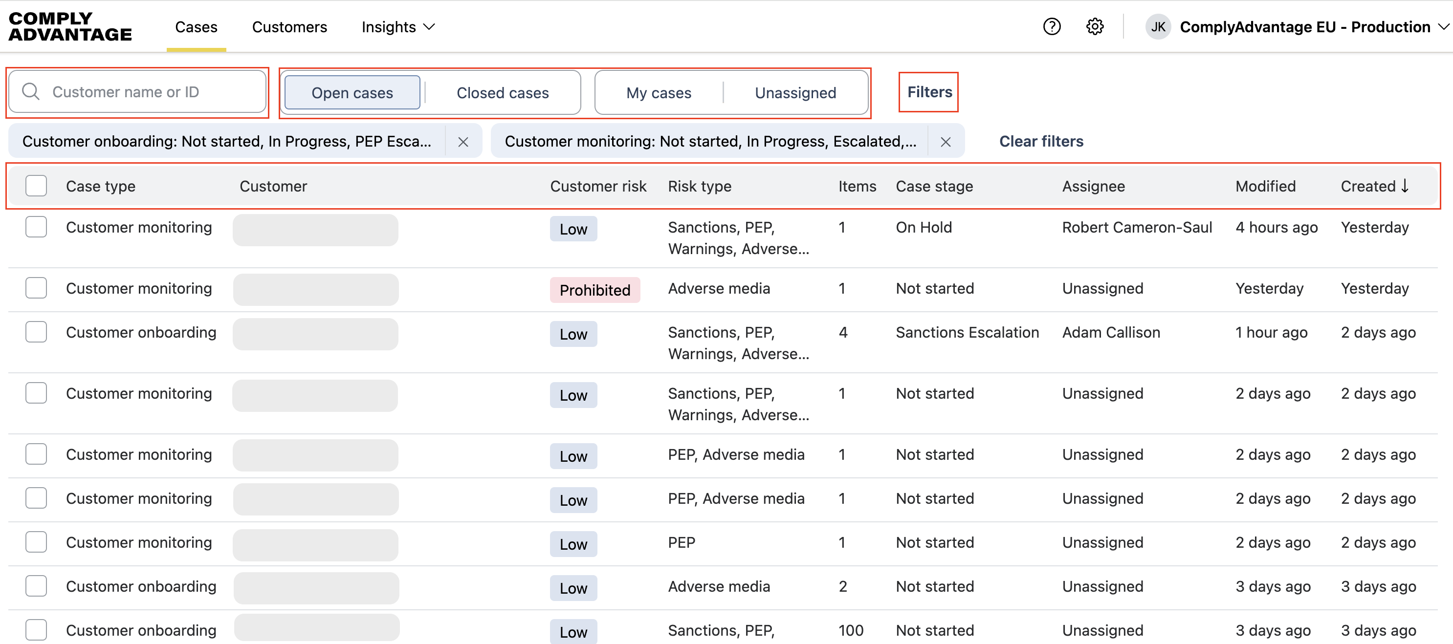 A case is created for a customer in ComplyAdvantage Mesh if they have a hit. The case contains information about the customer, including any alerts raised. An alert is a signal that something suspicious was found.