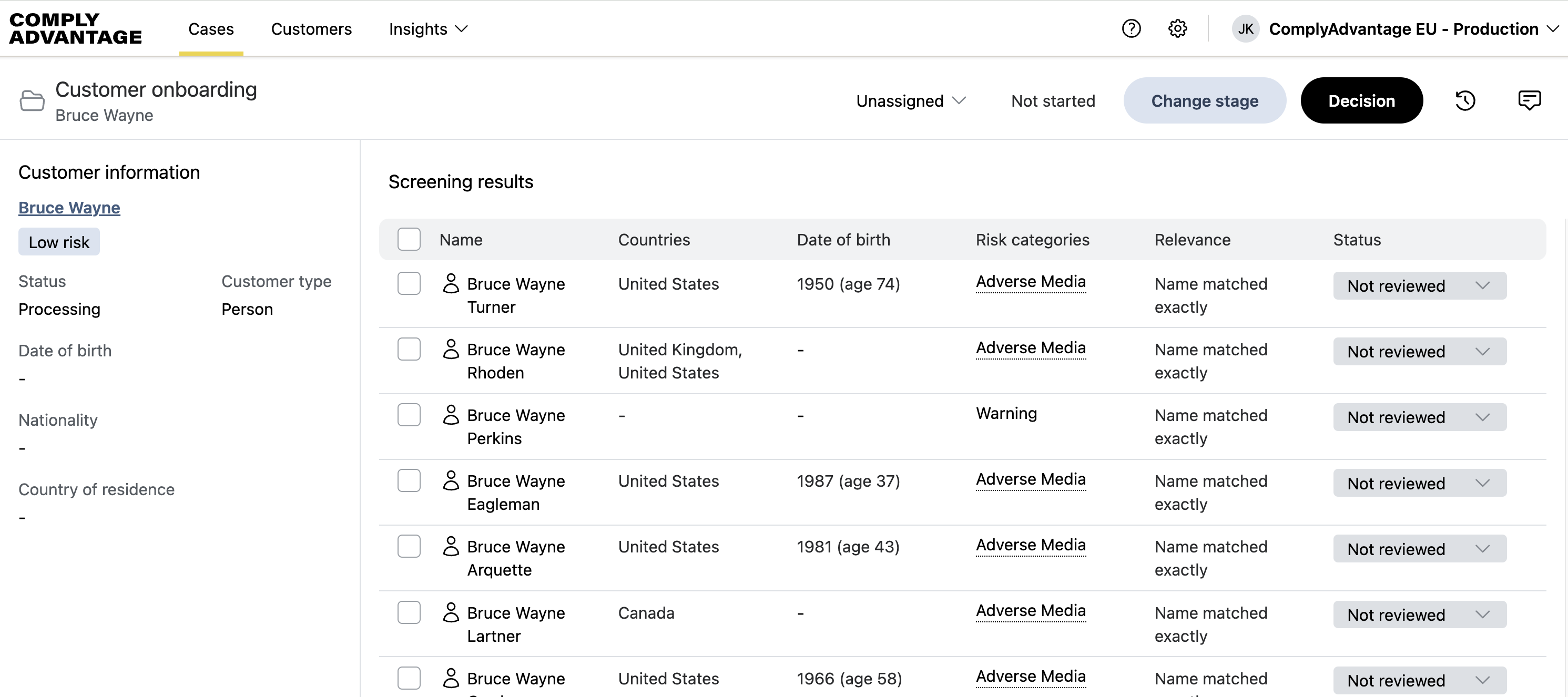 The information displayed for a case depends on the case type. Below is an example of a customer onboarding case. Click a row to open a screening result.