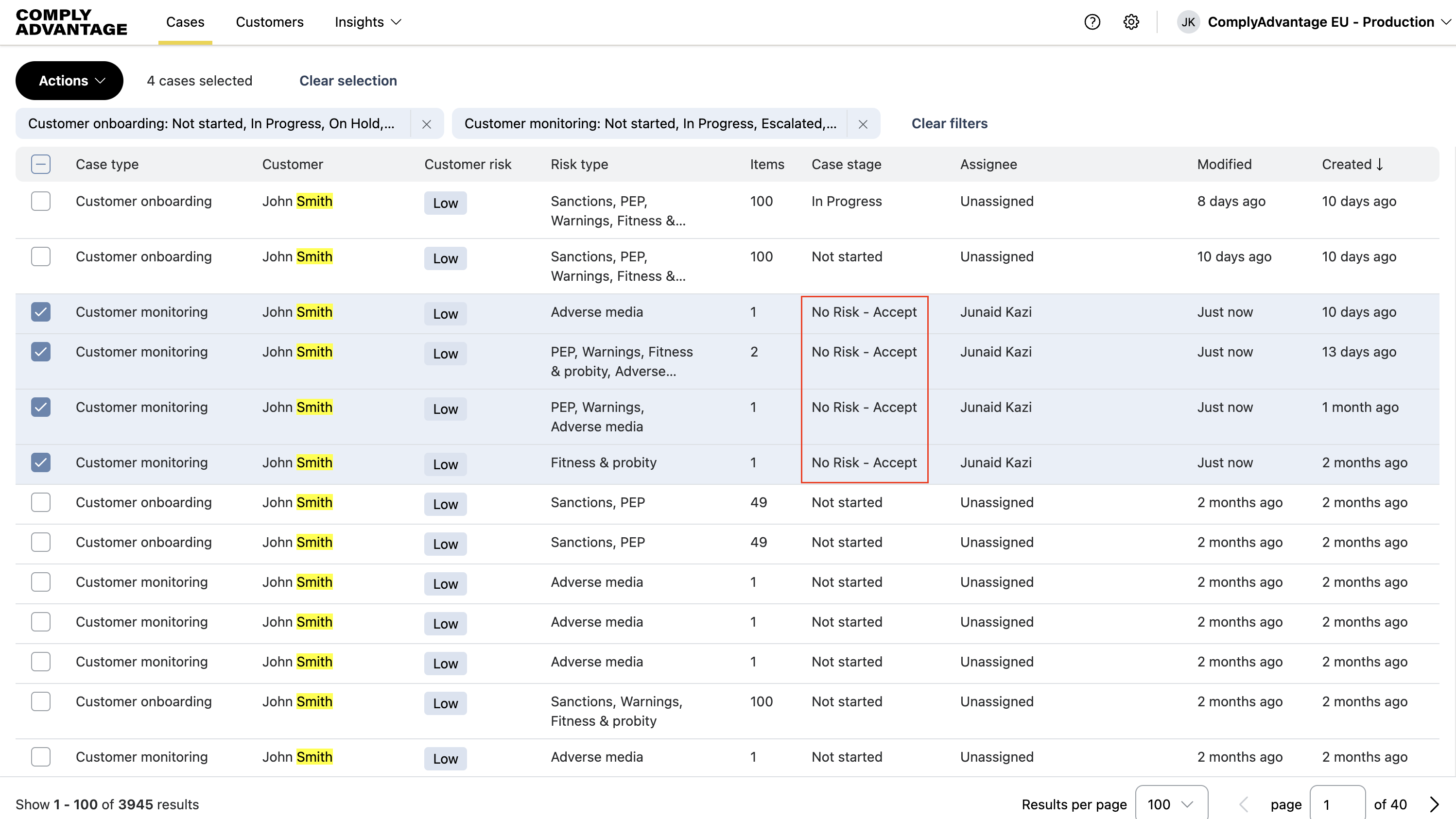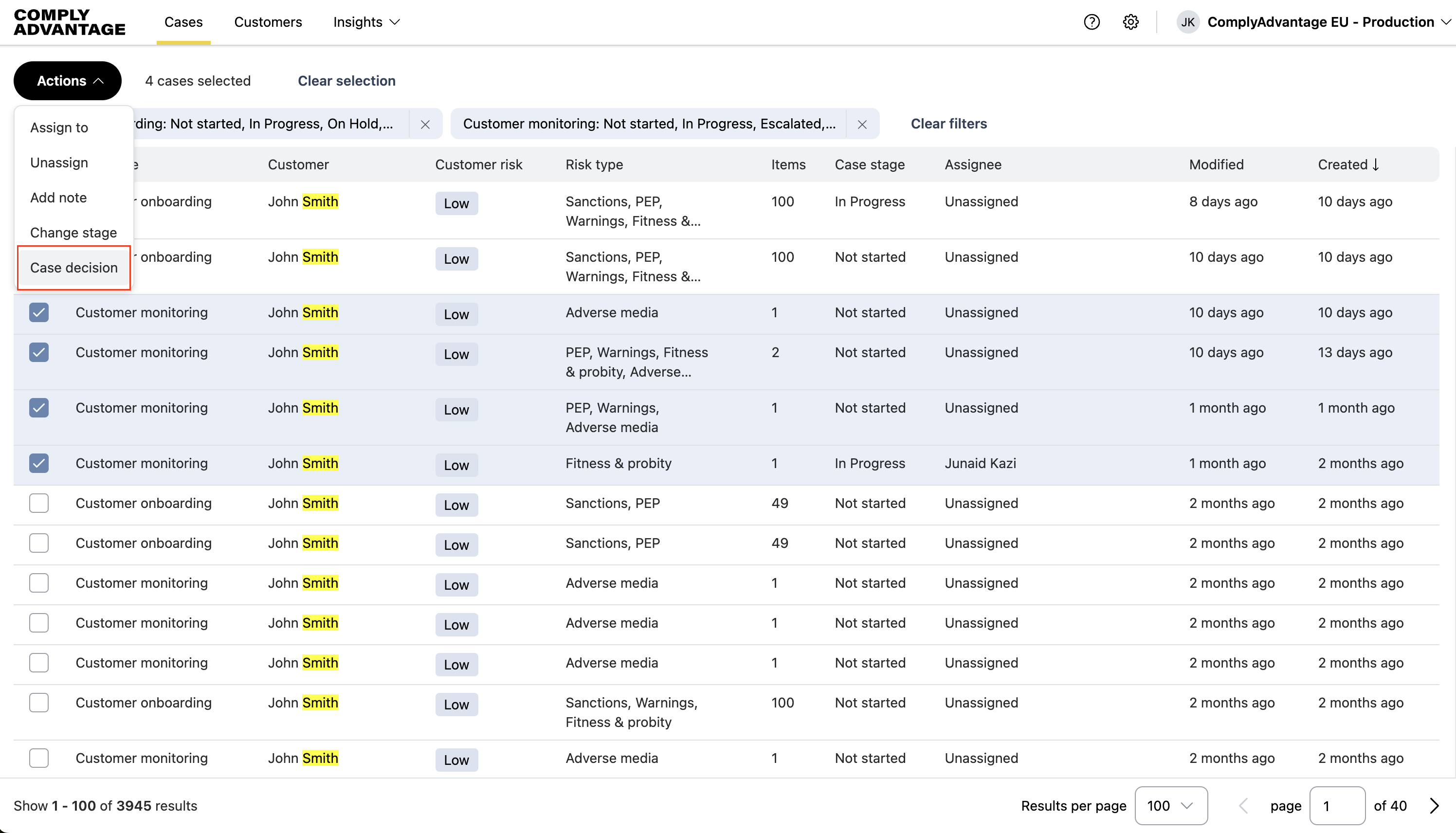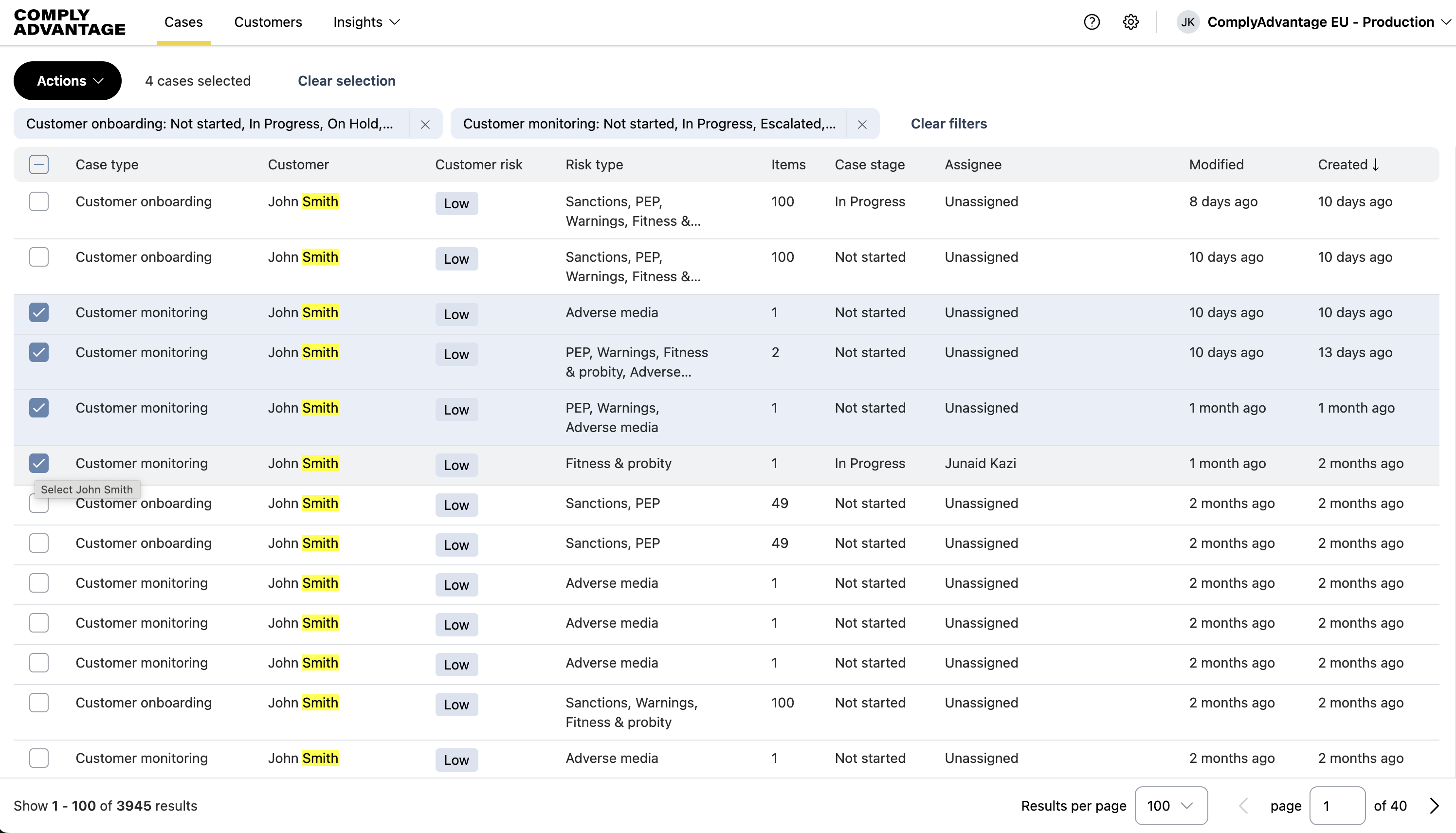 If you want to select all the cases in view, use the Select all option at the top of the table. This only selects the cases displayed on the first page, up to a maximum of 100 cases.