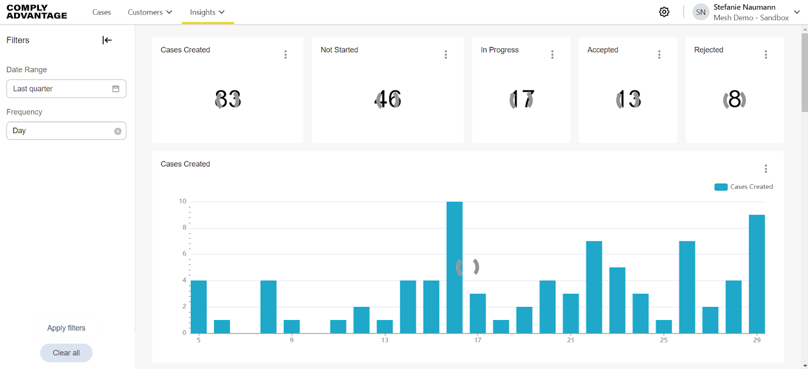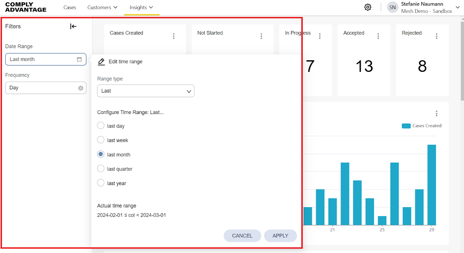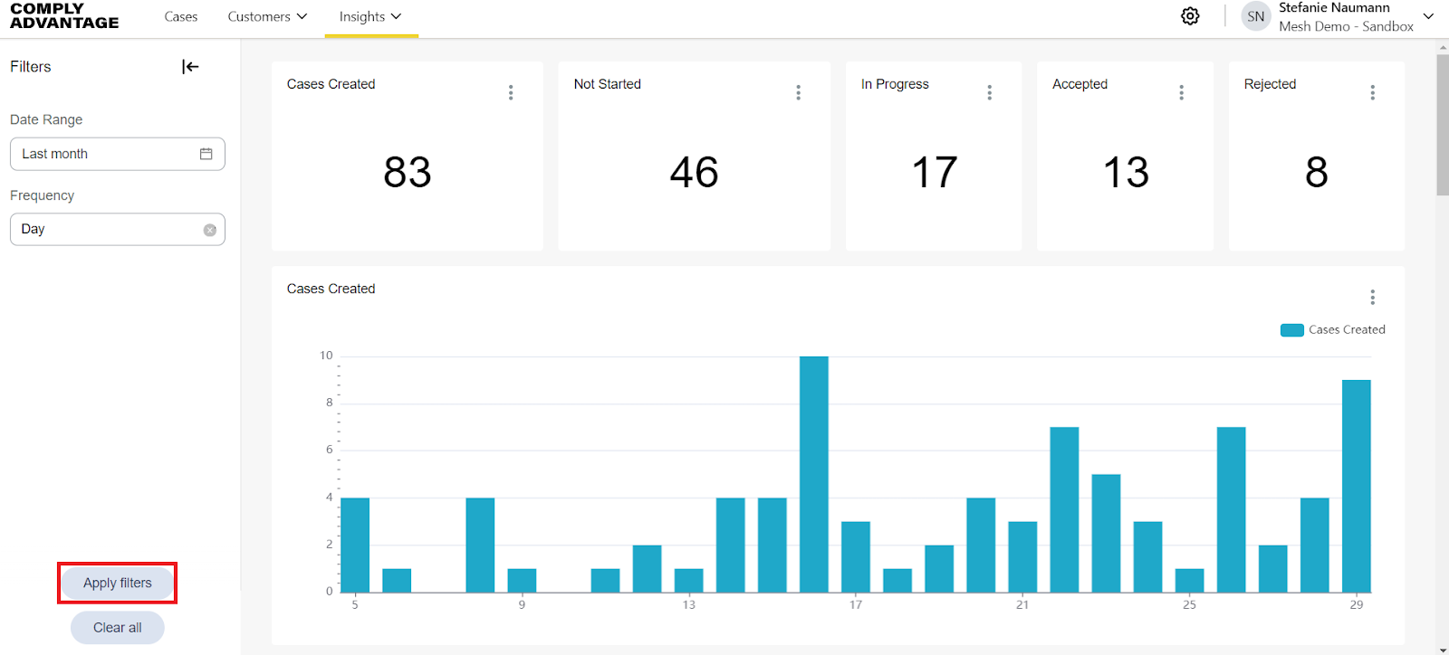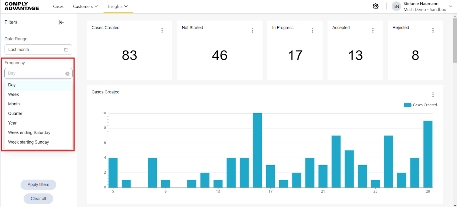 To tailor the charts and metrics in the insights dashboard you can apply filters for the date range and frequency.